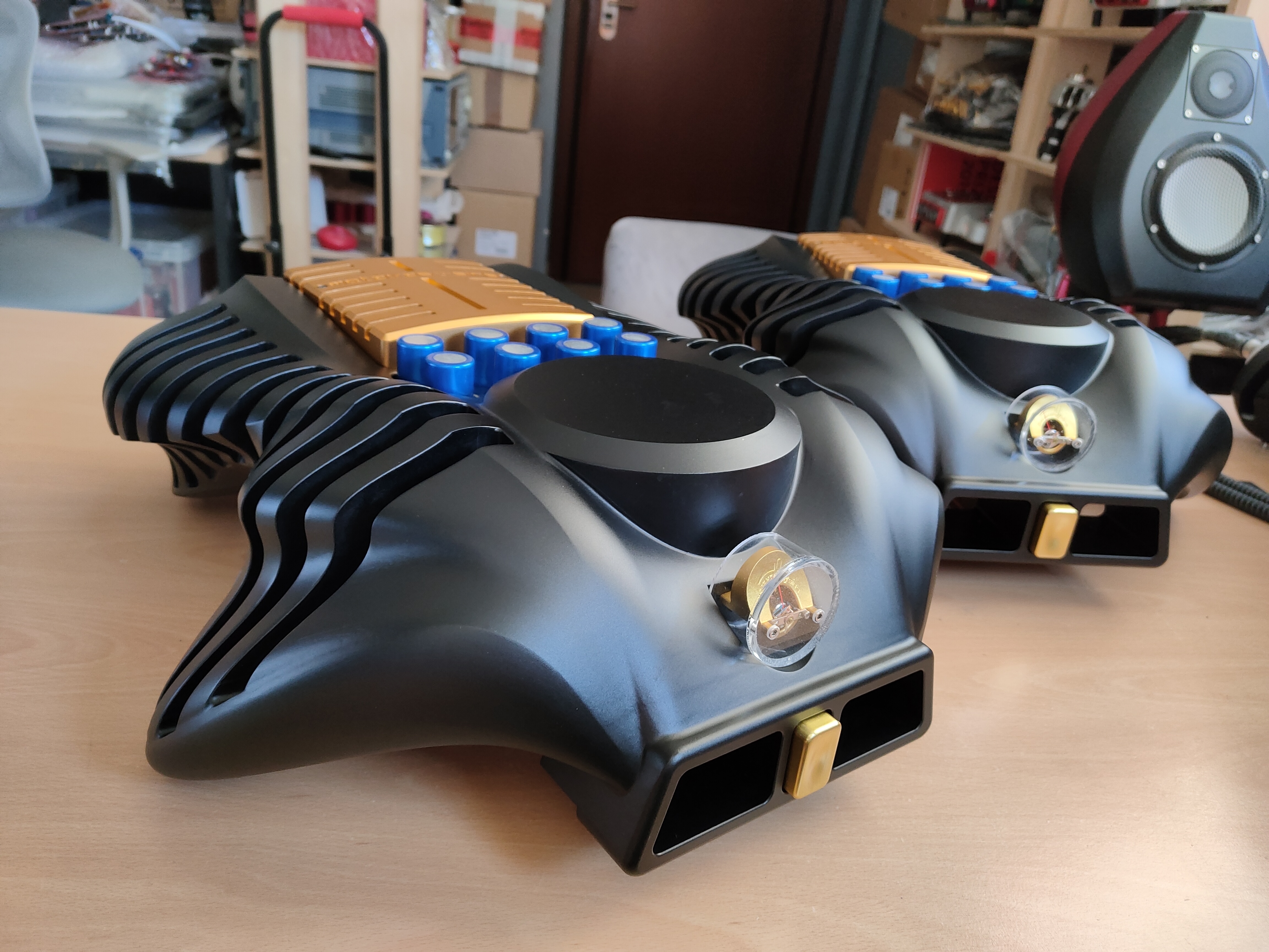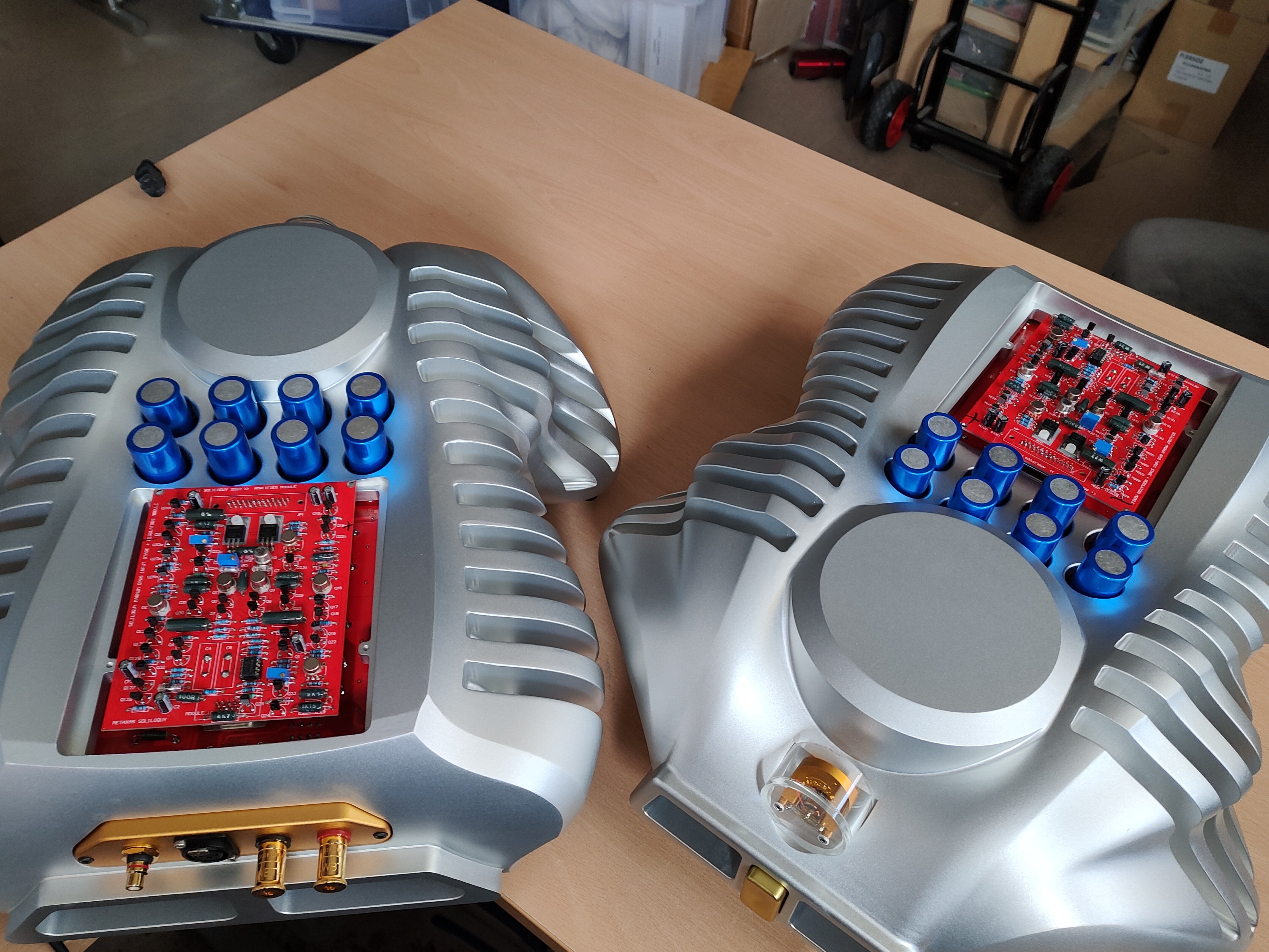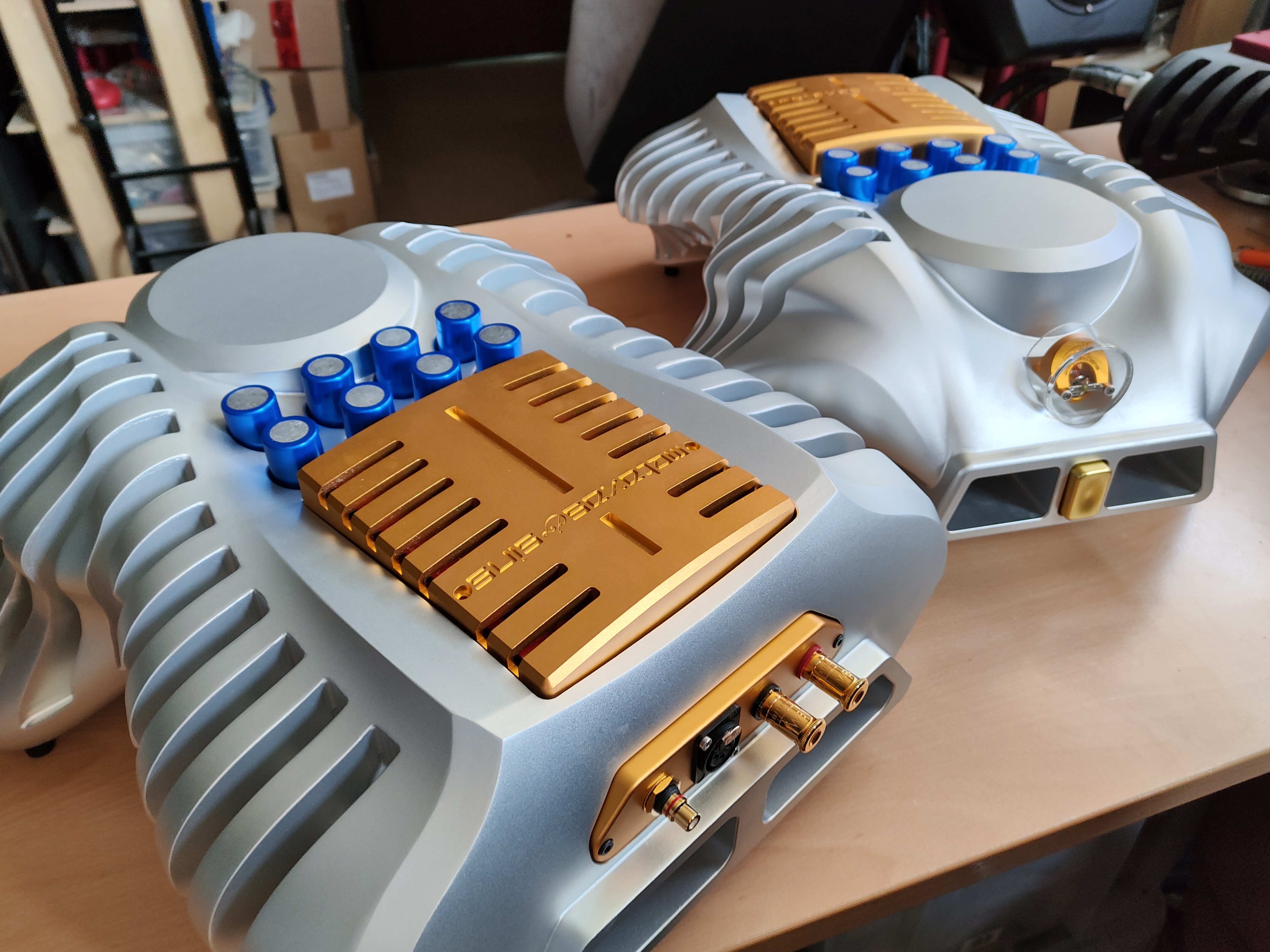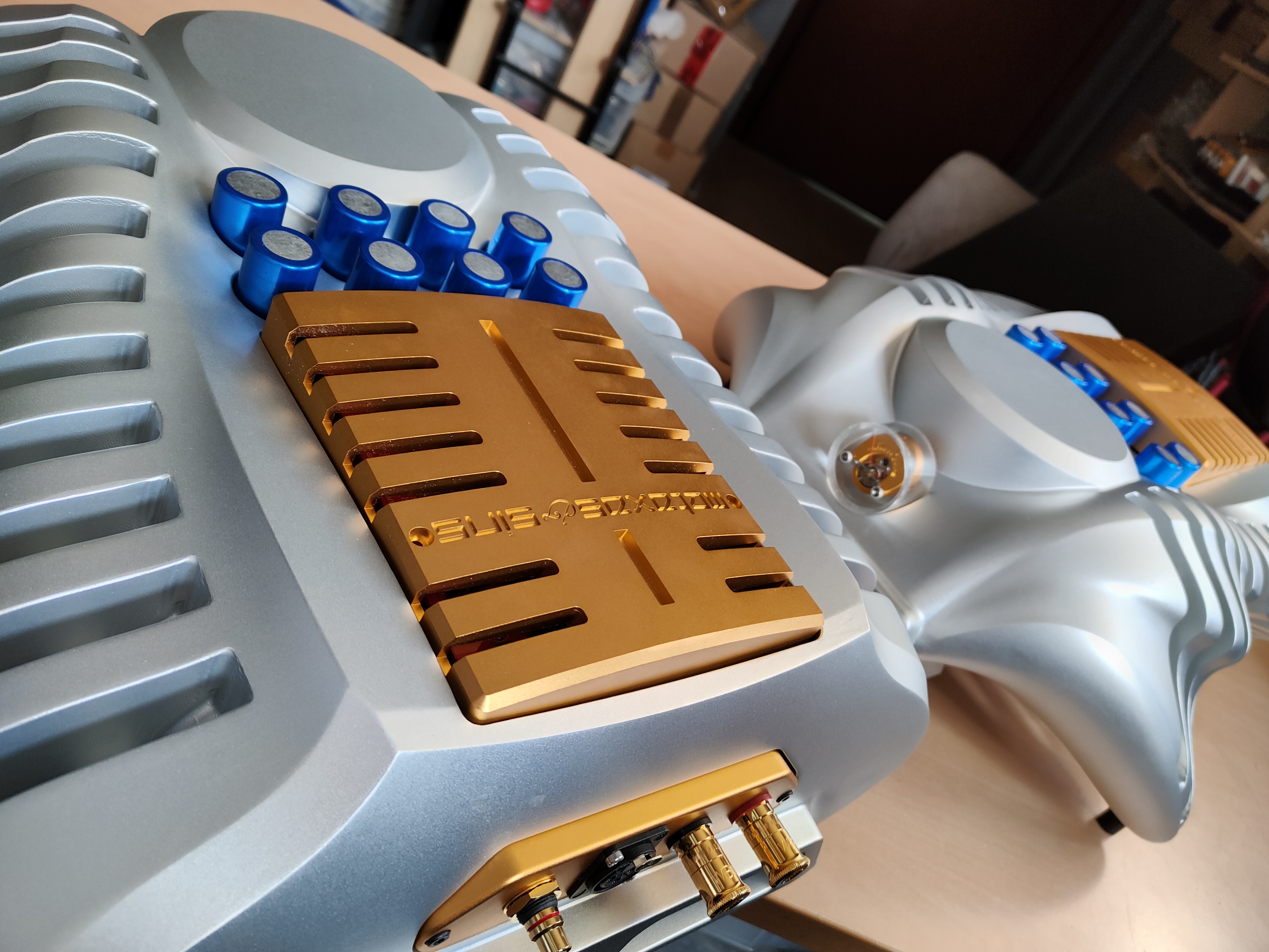 All connectors are of the highest quality, and every component, including the 40,000uF computer grade capacitors are directly connected to the printed circuit “high-current” board